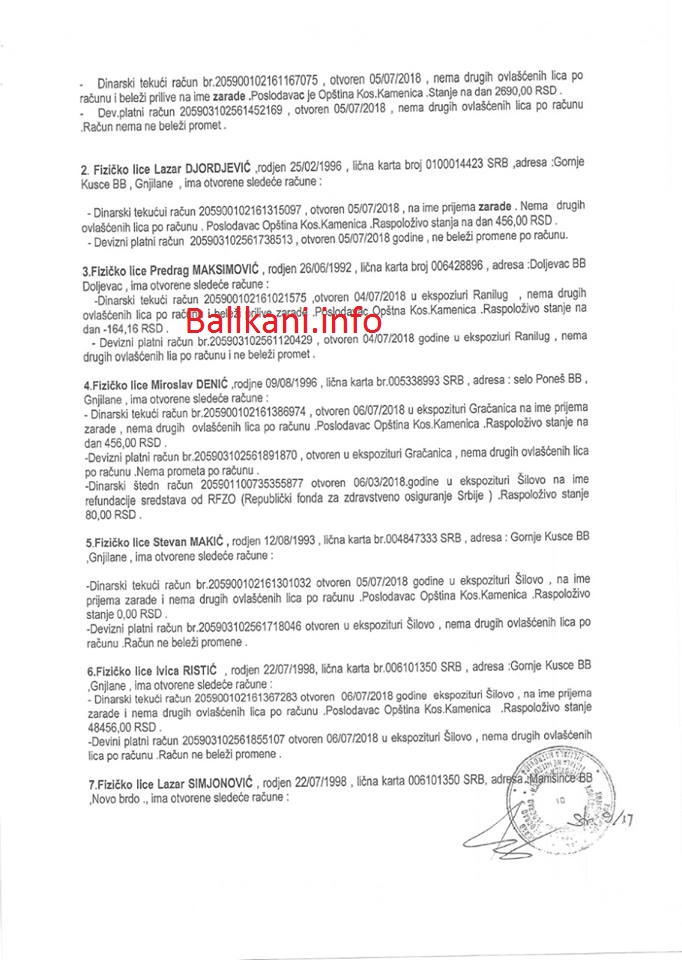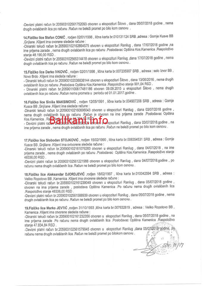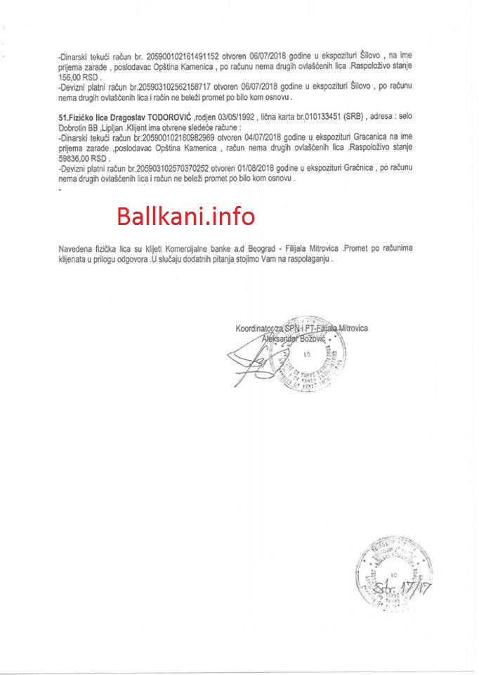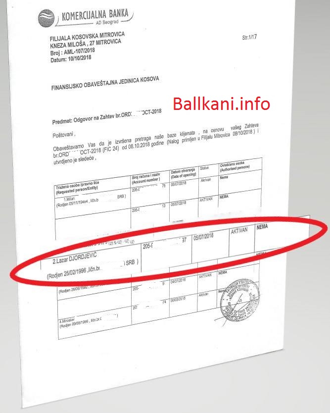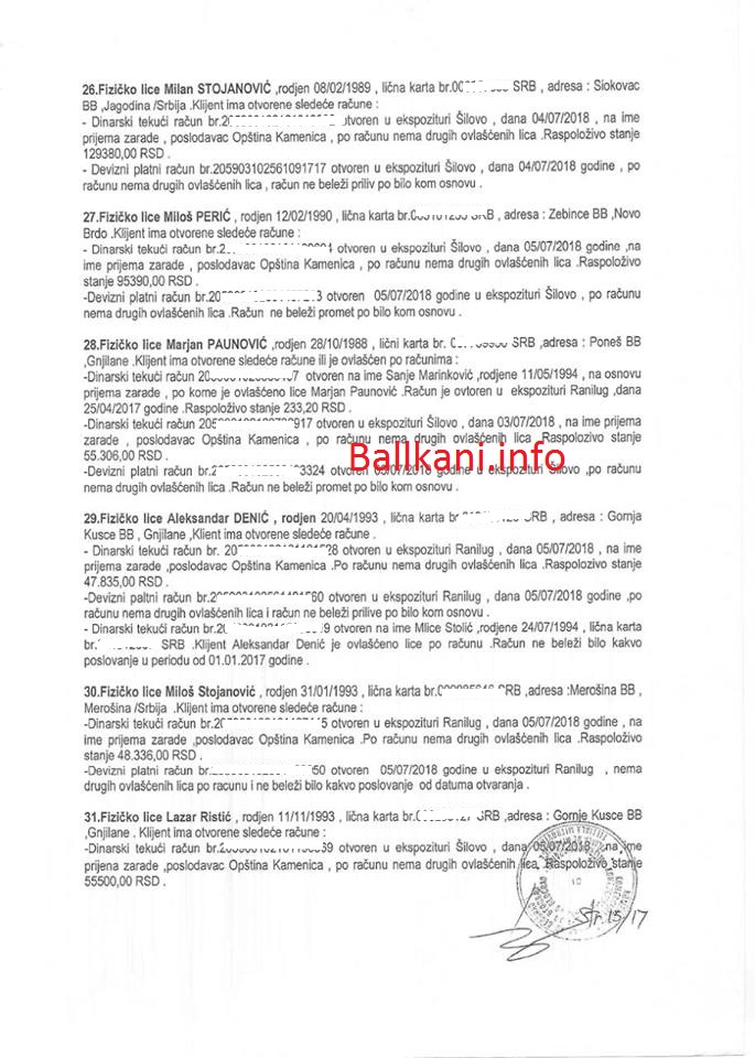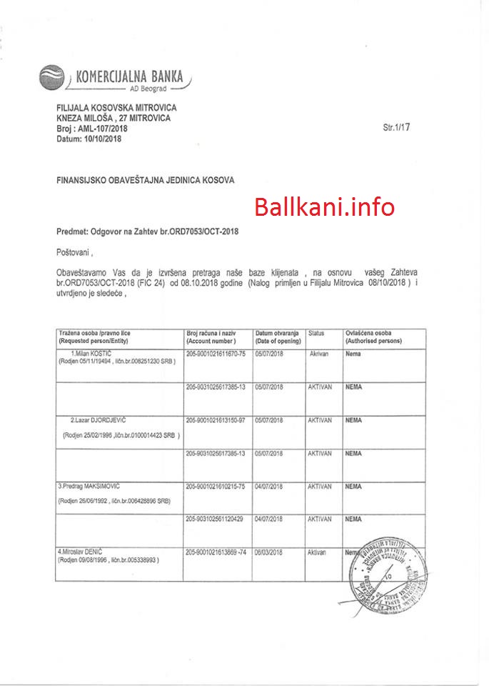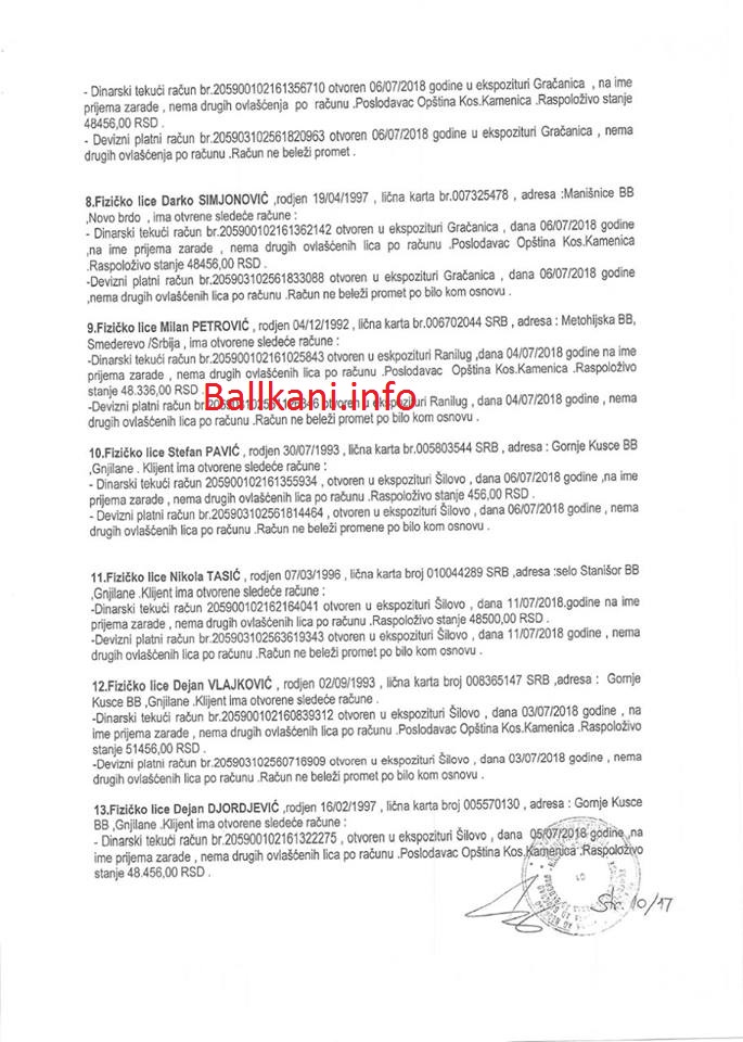 Të gjithë këta persona, pjesëtarë të Forcës së Sigurisë së Kosovës të komunitetit serb, siç dëshmohet edhe përmes dokumenteve të siguruara, kanë hapur llogari bankare në “Komercijalna Banka” të Serbisë që operon në territorin e Kosovës.