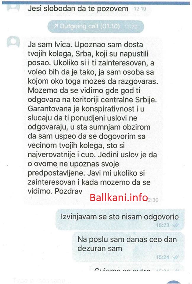 Një ftesë e tillë, një pjesëtari serb të Forcës së Sigurisë së Kosovës i është dërguar nga “Ivica”, i cili i shkruan se “kam takuar mjaft kolegë tu, serbë, që kanë lëshuar punën. Nëse je i interesuar, e dëshiroj që të jetë kështu, unë jam personi me të cilin mund të bisedosh për këtë”.