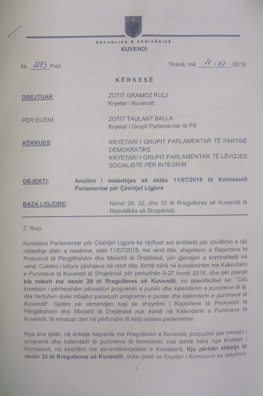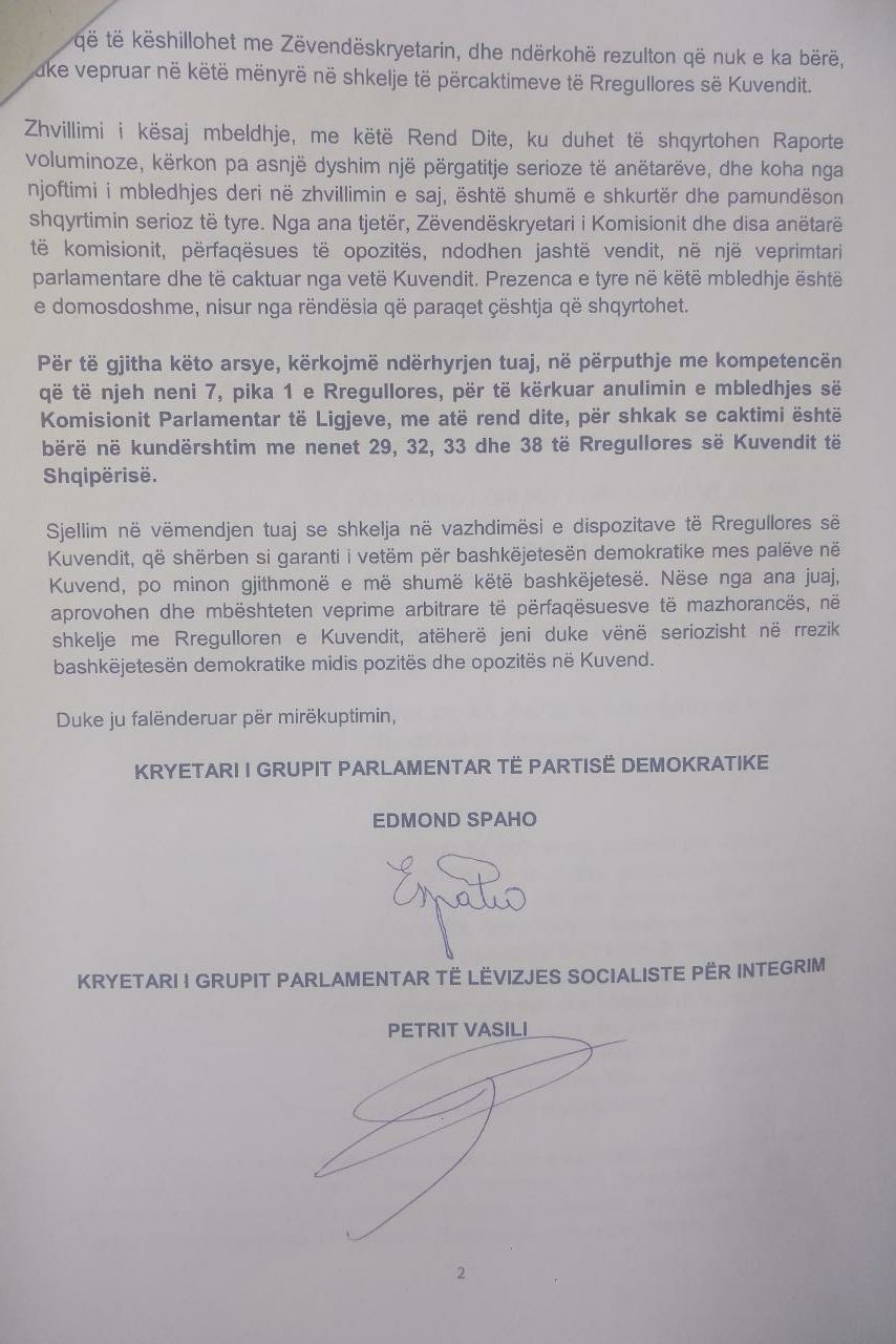 Nëpërmjet një letre drejtuar Kryetarit të Kuvendit, Gramoz Ruçi, Kryetarët e grupeve të PD dhe LSI, Edmond Spaho dhe Petrit Vasili shprehin kundërshtimin e opozitës për zhvillimin e mbledhjes në shkelje flagrante të Rregullores së Kuvendit.