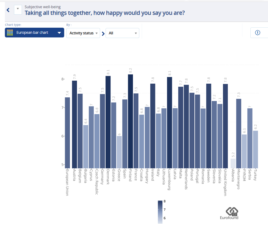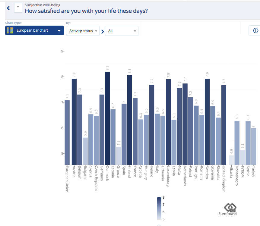 Për pyetjen “Sa të kënaqur jeni ju me jetën tuaj ditët e sotme”, për të gjitha moshat dhe gjinitë, Shqipëria ka një mesatare prej 4.9 pikë, që është më e ulëta në Europë. Pas Shqipërisë renditen Maqedonia me 5.1 pikë, Greqia me 5.3 pikë dhe Bullgaria me 5.6 pikë .