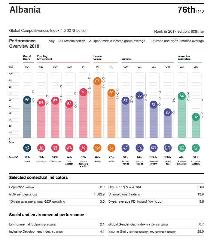Shqipëria ka renditjen më të mirë në treguesin e shëndetit dhe edukimit primar. Edhe edukimi i lartë dhe trajnimi kanë renditje pozitive. Më keq Shqipëria paraqitet në treguesin e risive dhe sofistikimit.
