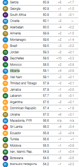 Garën rajonale duket se e ketë fituar Serbia, e renditur e 65-a, ndjekur nga Mali i Zi, i 71-i. Ndërsa Shqipëria, në kompleksin e komponentëve të studiuar, renditet më lart se sa Maqedonia e 84-a dhe Bosnja e Hercegovina e 91-a.