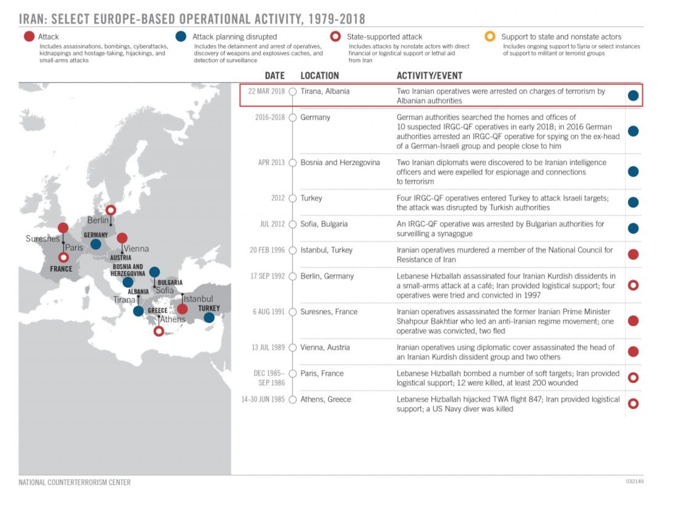 Ai ka publikuar raportin e Departamentit të Shtetit “Akvititeti operacional i Iranit në Europë”, ku thuhet shprehimisht se, në datën 22 mars 2018, 2 operativë iranianë janë arrestuar në Shqipëri me akuzën e terrorizmit.