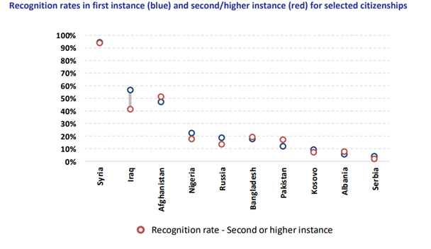 Në raport thuhet se vendet me normë më të ulët të pranimit të kërkesës për azil janë vendet e Ballkanit Perëndimor si Shqipëria, Kosova apo Serbia.