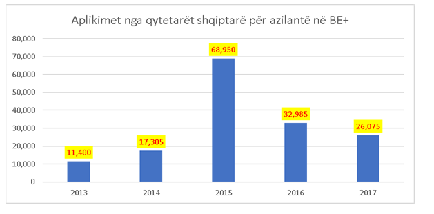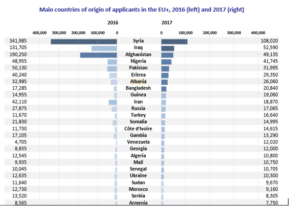 Shqipëria vijon të listohet në top 10 vendet me numrin më të lartë të aplikantëve për azil në Bashkimin Europian, ku sipas të dhënave 4% e azilkërkuesve ishin me origjinë nga Shqipëria. Megjithatë numri i aplikantëve për herë të parë ka ardhur në rënie. Në 2016-n sipas raportit numri i aplikantëve nga Shqipëria ishte 32985, ndërsa në 2017-n numri i aplikantëve shënoi 26060. Shqiptarët u renditën të shtatë pas vendeve ku konfliktet civile vijojnë.