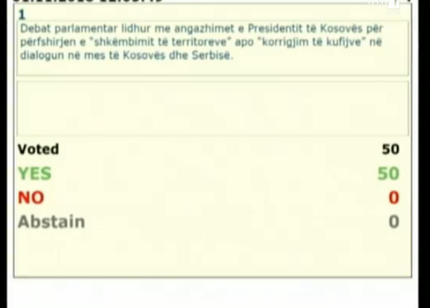 Në seancën e jashtëzakonshme që u zhvillua sot, vetëm 50 deputetë kanë votuar për rezolutën e propozuar nga Lidhja Demokratike e Kosovës e cila përcakton angazhimin e presidentit të Kosovës Hashim Thaçi në dialogun me Serbinë.