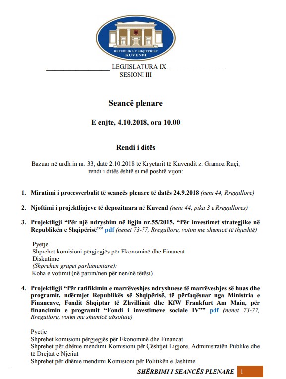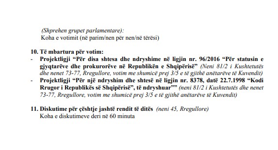 Kryetari i Prlamentit në vendimin e tij, për Pikën 10. ka futur si të mbartura në votim Projektligjin “Për disa shtesa dhe ndryshime në ligjin nr. 96/2016 “Për statusin e gjyqtarëve dhe prokurorëve në Republikën e Shqipërisë”, dhe Projektligjin “Për një ndryshim dhe shtesë në ligjin nr. 8378, datë 22.7.1998 “Kodi