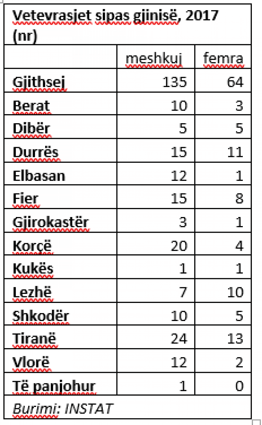 Meshkujt janë ata që dorëzohen më shpejt përpara vështirësive të jetës, me 68% të vetëvrasjeve në total. Rekordi është në Elbasan ku 12 meshkuj vranë vetën në 2017-n dhe vetëm një femër.