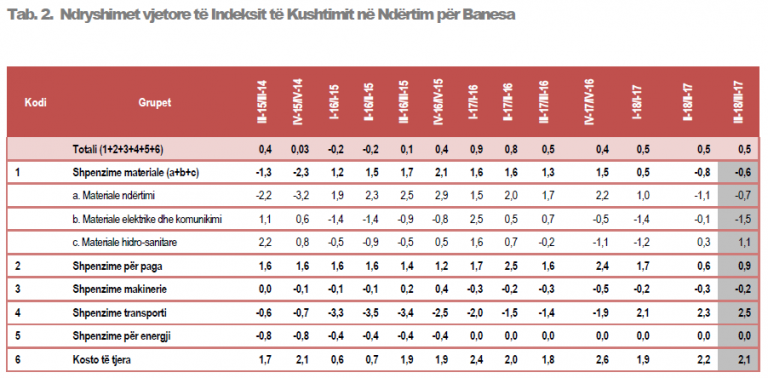 Kostot e ndërtimit kanë shënuar një rritje të ngadaltë dhe të qëndrueshme gjatë tremujorëve të fundit. Sipas INSTAT, Indeksi i kushtimit në ndërtim, në tremujorin e tretë 2018 arriti 103.6, duke shënuar rritje me 0.5 %, në krahasim me tremujorin e tretë 2017.