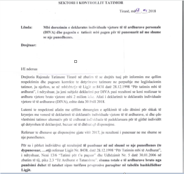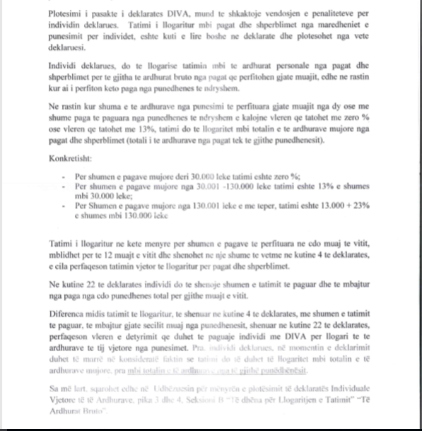 Burime zyrtare të tatimeve dhanë argumentet se pse kërkonin që tatimi mbi të ardhurat të llogaritej në bazë të shkresës që ata u kanë dërguar individëve: