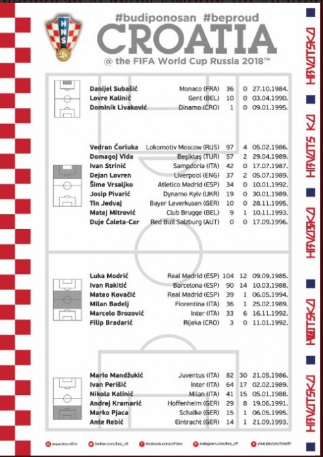 Trajneri i Kroacisë, Zltato Daliç ka bërë publike listën me 23 lojtarë që do të udhëtojnë drejt Rusisë për Kupën e Botës 2018. Ish-tekniku i Dinamos së Tiranës, ka eliminuar nga lista provizore, Leitician, Barisiç, Niziç, Soza, Rog, Pasaliç, Çop dhe Santini.