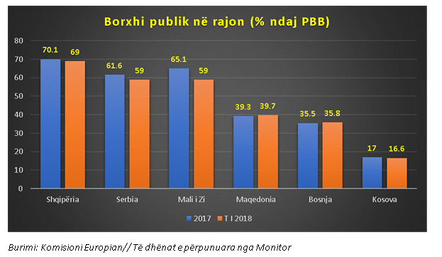 Por, 2017-a u mbyll me një borxhi publik prej 70.1% të PBB-së, ndërsa në tremujorin e parë të këtij viti kishte zbritur në 69%, që sipas të dhënave të Komisionit Europian për vendet kandidate është më i larti në rajon. Ndryshe nga Shqipëria, Mali i Zi dhe Serbia kanë arritur ta ulin ndjeshëm këtë tregues në të njëjtën periudhë, duke e zbritur atë në 59% të PBB-së në tremujorin e parë, pra 10 pikë përqindje më pak sesa tek ne.