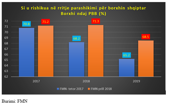 Si rrjedhojë, në prill të këtij viti, FMN ndryshoi pritshmëritë me rritje për ecurinë e këtij treguesi në raport me tetorin e vitit të kaluar, sipas statistikave të saj zyrtare. Për vitin 2018, FMN pret që borxhi të jetë 71.3% e PBB-së, më i lartë sesa pritshmëritë e fundit të qeverisë prej 68.7% e PBB-së në kuadrin e fundit buxhetor afatmesëm. Projeksioni i FMN është rritur dukshëm edhe për vitin 2019 (shih grafiket e parashikimit të FMN dhe ndryshimit të projeksionit në prpjekbuxhetet e qeverisë). FMM pret që borxhi të jetë 68.5% e PBB-së në 2019-n, përkundrejt projeksionit të qeverisë prej 66.4%./Monitor/