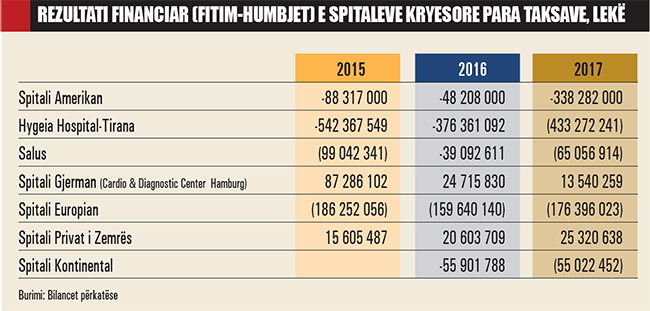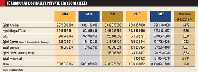 Sipas të dhënave nga bilancet përkatëse, 7 spitalet dhe klinikat kryesore private në vend, Spitali Amerikan, Hygeia Hospital – Tirana, Salus, Spitali Gjerman (Cardio & Diagnostic Center Hamburg / TIR), Spitali Europian, Spitali Privat i Zemrës, Spitali Kontinental kanë qarkulluar në 2017-n në total rreth 8.9 miliardë lekë, apo rreth 66 milionë euro, me një rritje prej 6%, në raport me 2016.