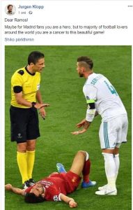 “I dashur Ramos, ndoshta për tifozët e skuadrës tënde mund të jesh hero, por për ata që e duan futbollin në gjithë botën je një kancer për këtë sport”, shkruante trajneri Jurgen Klop.