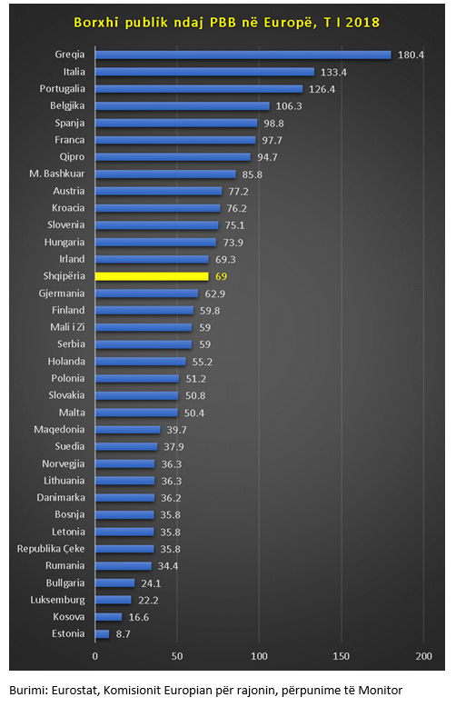 Me një borxh publik, që vlerësohet të ketë arritur në rreth 69% të Prodhimit të Brendshëm Bruto, PBB, në tremujorin e parë të këtij viti, Shqipëria rezulton e 14-a në Europë për nga niveli më i lartë i tij, në 35 shtete. Shifrat janë përpunuar nga Monitor, bazuar në të dhënat e Eurostat për 28 vendet e Bashkimit Europian dhe Komisionit Europian për vendet kandidate (shih grafikun në fund).