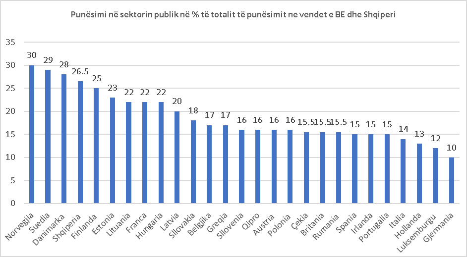 Kështu Shqipëria renditet menjëherë pas Suedisë (29%) dhe Danimarkës (28%) për peshën e lartë që sektori shtetëror ka në totalin e punësimit, përjashtuar bujqësinë, përkatësisht me 26.5 %. (në Suedi pesha e bujqësisë në punësim është 2% dhe në Danimarkë 3%), sipas Bankës Botërore).
