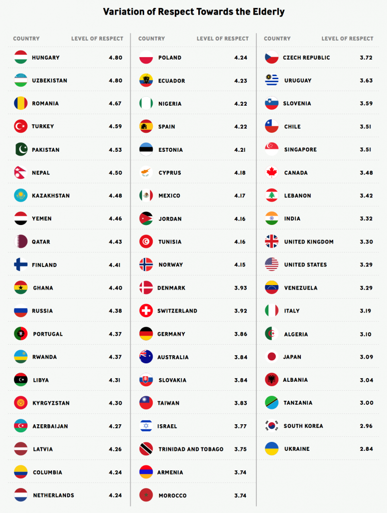 Çdo anketues ka pyetur të intervistuarit në lidhje me respektin e shoqërisë ku ata janë pjesë ndaj të moshuarve. Të intervistuarit kanë klasifikuar nivelin e respektit me një shkallë nga 1 (shumë e ulët) në 5 (shumë e lartë). Të gjithë anketat janë mbledhur mbi bazë të informacionit socio-demografik, siç është mosha e të intervistuarit.