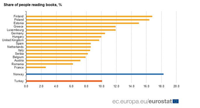 Në Shqipëri mungojnë statistika të qarta mbi shumën e shpenzuar për libra, gazeta etj, por shifrat sugjerojnë se konsumimi i tyre në Biblioteka ka qenë në rënie, duke pësuan përgjysmin në 2017, nga një vit më parë. Eurostat tregon se përqindja e njerëzve që lexojnë libra në Serbi, është më e lartë se në Belgjikë, Austri, Rumani apo Francë. Ndërsa kryeson listën në Europë Finlanda, pasuar nga Polonia dhe Estonia, me përqindjen më të madhe të njerëzve që lexojnë libra, përkatësisht 17 %, 16.5 % dhe 15 %.