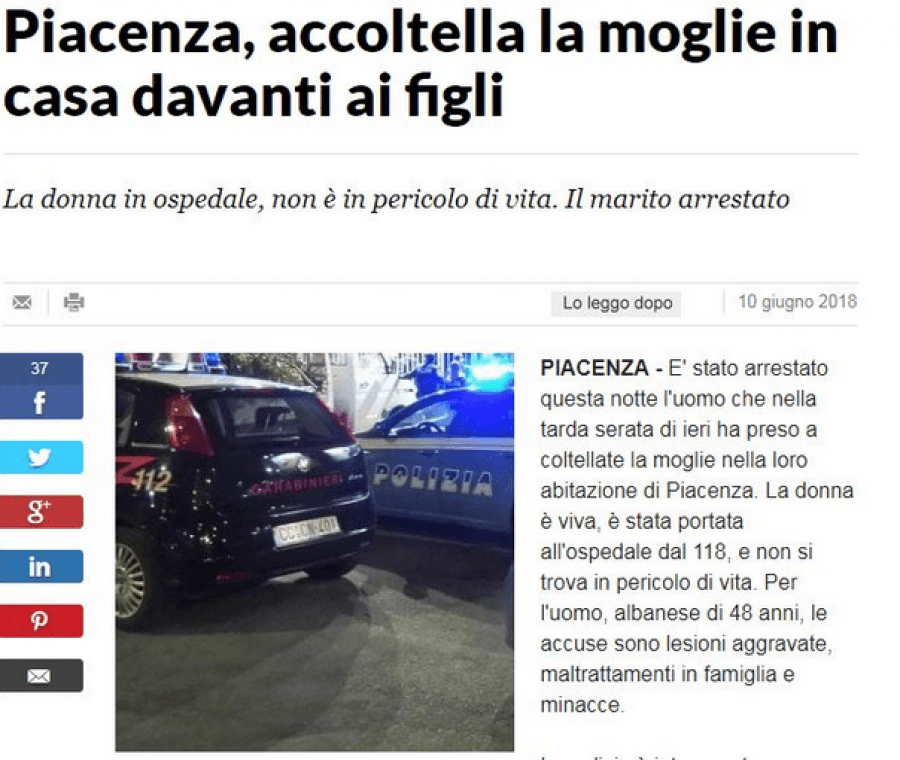 Një 48 vjeçar shqiptar ka plagosur me thikën e kuzhinës bashkëshorten e tij 28-vjeçare në qytetin e Piacencës në Itali.