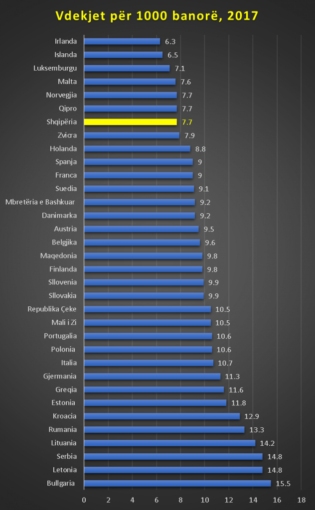 Sipas grafikut të hartuar nga Monitor, bazuar në këto të dhëna, Shqipëria renditet në vend të shtatë në Europë, për nga niveli i ulët i vdekshmërisë, pas Irlandës, Islandës, Luksemburgut, Maltës, Norvegjisë, Qipros, duke pasur madje të njëjtin nivel me Qipron dhe Norvegjinë.