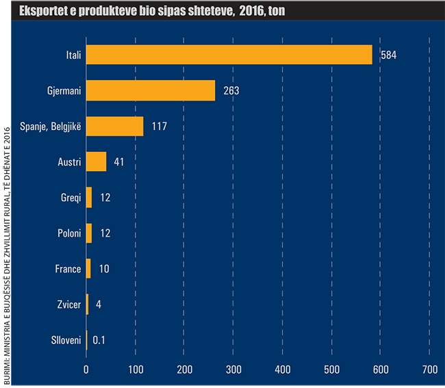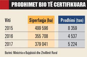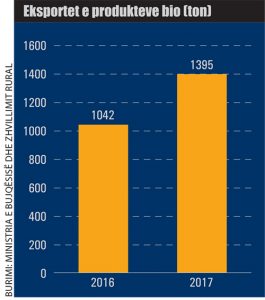 Nga 5223 tonë të prodhuara si produkte organike në 2017, vetëm 1395 tonë janë dërguar për eksport.