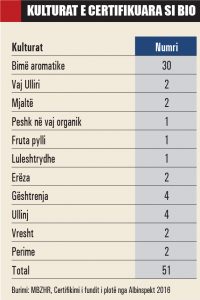 Sipas të dhënave të MBZHR, vitin e kaluar, sipërfaqja e mbjellë e certifikuar si organike, ishte rreth 380 hektarë, ndërsa si sasi e prodhuar e kulturave organike ishin mbi 5 mijë tonë. E krahasuar me një vit më parë, pra më 2016-n, prodhimi ishte me rritje me rreth 15%.