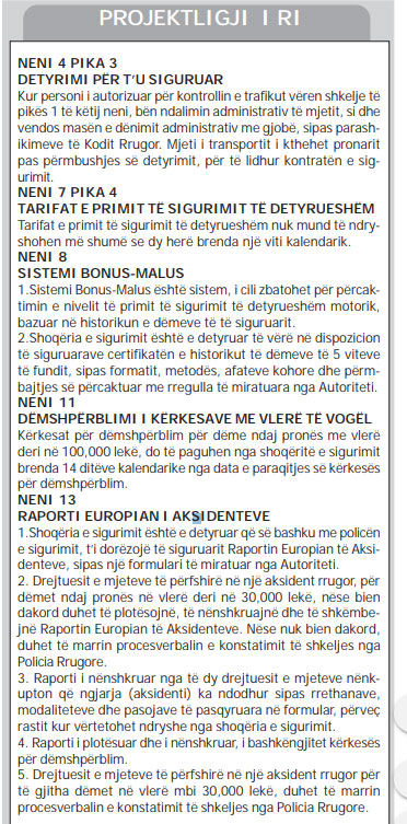 Marrëveshje mes drejtuesve të përfshirë në aksident, nuk mund të nënshkruhet për dëmet me vlerë mbi 30 mijë lekë. Sipas projektligjit të ri, kompanitë nuk mund të ndryshojnë më shumë se 2 herë në vit çmimet e siguracioneve të makinave. Drafti i ri parashikon që për dëmet me vlerë deri në 100 mijë lekë, duhet të paguhen nga kompanitë brenda 14 ditëve nga paraqitja e kërkesës për dëmshpërblim./Panorama/