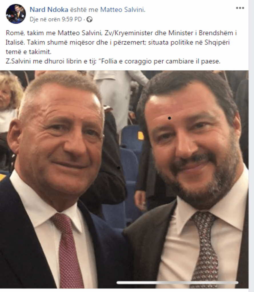 “Takimi shumë miqësor dhe i përzemert; situata politike në Shqipëri temë e takimit. Z.Salvini me dhuroi librin e tij: “Follia e coraggio per cambiare il paese”.