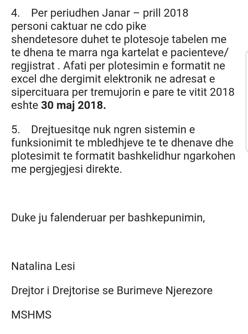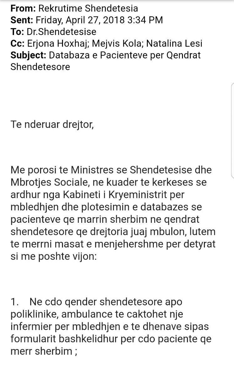 Ministria e Shëndetësisë ka shpërndarë një email të njëjtë me atë te Ministrisë së Arsimit, ku urdhëron mjekët të mbledhin të dhënat personale të pacientëve në qendrat shëndetësore.