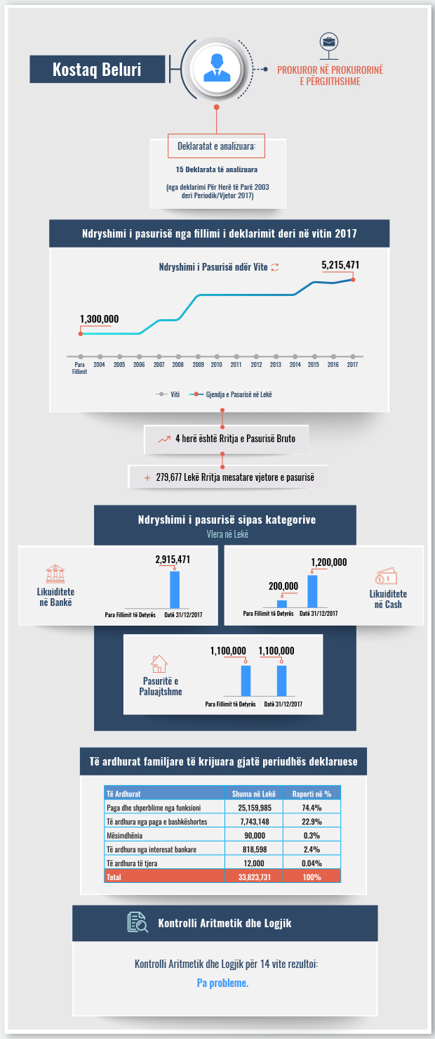 Të dhënat e analizuara nga BIRN tregojnë se prokurori Beluri zotëronte pasuri familjare në vlerën e 1.3 milionë lekëve në vitin 2003-kur deklaroi pasurinë për herë të parë. Në fund të vitit 2017, pasuria familjare e zotit Beluri kap vlerën e 5.2 milionë lekëve.