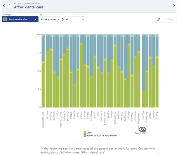 Sipas Anketës Europiane të Cilësisë së Jetës, të Komisionit Europian, 77 për qind e të anketuarve shqiptarë u përgjigjen se e kanë shumë të vështirë që të përballojnë shërbimet e përkujdesit dentar, duke u renditur të parët në Europë. Pas Shqipërisë renditet Greqia, ku 68 për qind e të anketuarve kanë thënë se e gjejnë të vështirë apo shumë të vështirë që të përballojnë përkujdesjen dentare në vend. Me gjithë atë kanë një diferencë me 10 pikë përqindje në krahasim me Shqipërinë.