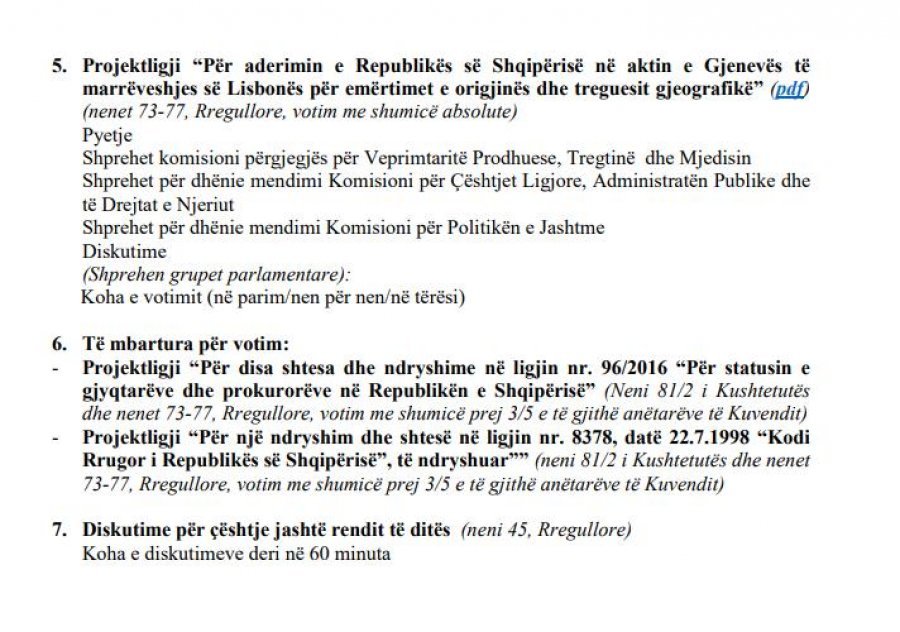 Si pikë e gjashtë është parashikuar Projektligji “Për disa shtesa dhe ndryshime në ligjin nr. 96/2016 “Për statusin e gjyqtarëve dhe prokurorëve në Republikën e Shqipërisë” dhe Projektligji “Për një ndryshim dhe shtesë në ligjin nr. 8378, datë 22.7.1998 “Kodi Rrugor i Republikës së Shqipërisë”.