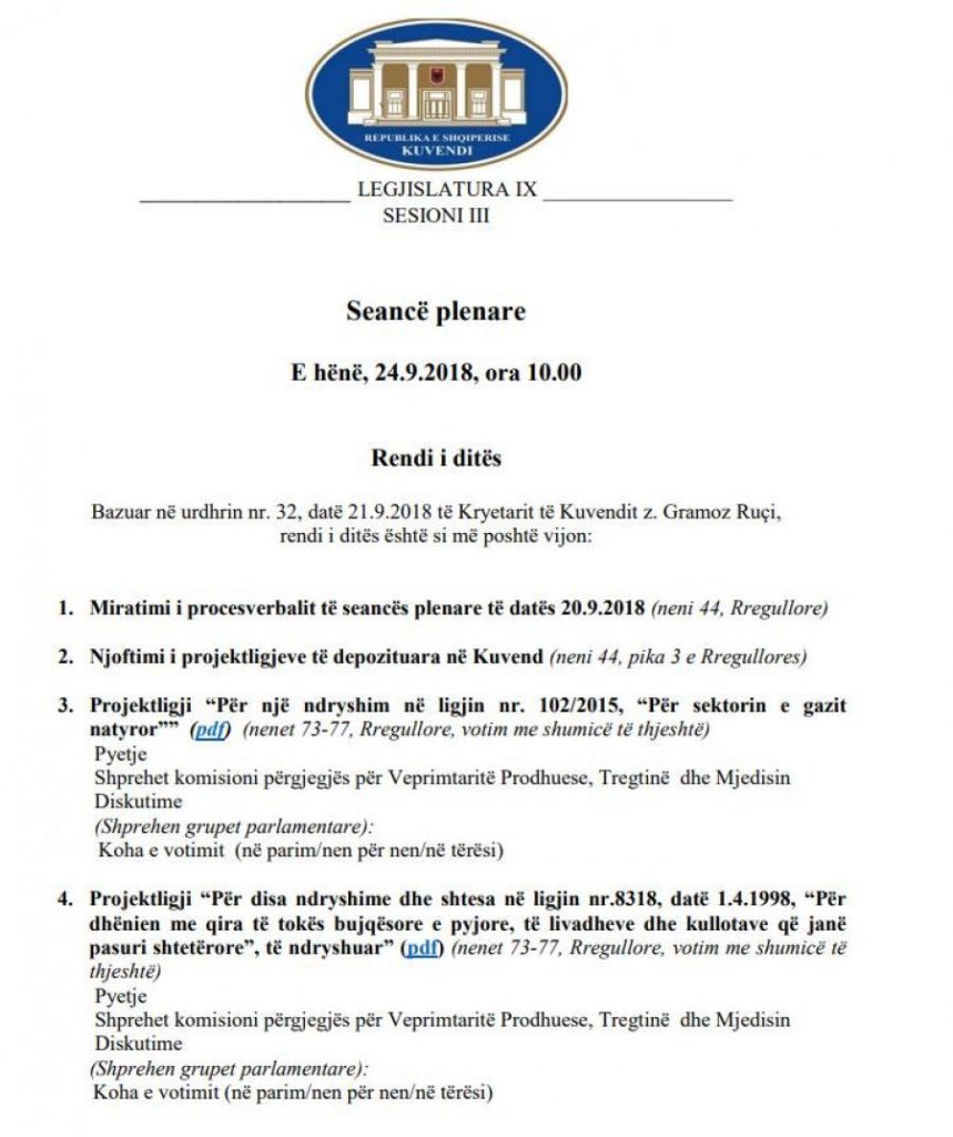Sot seanca plenare e Parlamentit të Shqipërisë sërish zhvillohet pa opozitën dhe me vendim të kryetarit Gramoz Ruçi janë parashikuar 7 pika të rendit të ditës.