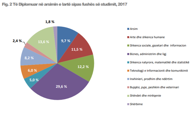 Fusha “biznes administrim dhe ligj”, shënon numrin më të lartë të të diplomuarve, me 29,6 %, ndjekur nga fusha “shëndet dhe mirëqenie” me 13,6 %, dhe “shkenca sociale, gazetari dhe informacion” me 12,2 %.