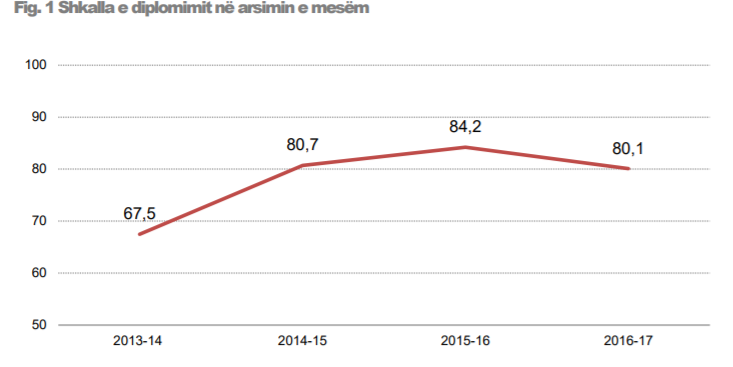 Ndërsa më 2017 në arsimin 9- vjeçar u diplomuan 36.546 nxënës, ose 96,4 % e nxënësve të klasës së nëntë të vitit shkollor 2016-2017, duke shënuar një rritje prej 1,4 pikë përqindje krahasuar me vitin paraardhës. Në këtë nivel arsimor, u diplomuan 52,7 % djem dhe 47,3 % vajza./Monitor/