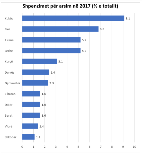 Pas Kukësit, qarku që shpenzon më shumë për arsim është Fieri, me 6.8% ndaj totalit. Më pas renditet kryeqyteti, Tirana me 5.2% të totalit të shpenzimeve për arsim dhe Lezha me të njëjtën peshë të shpenzimeve.