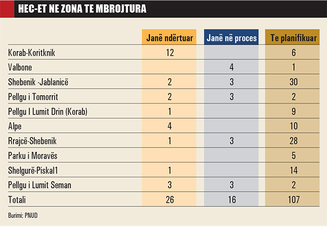 Një studim në terren i 20 ekspertëve të atashuar nga Programi i Zhvillimit të Kombeve të Bashkuara, PNUD ka vërejtur një situatë alarmante në të gjithë procesin që shoqëron ndërtimin e HEC-eve që nga momenti i dhënies së lejeve, planifikimit dhe ndërtimit. Dëmet më të mëdha janë bërë në zonat e mbrojtura, pasi aty dendësia e lumenjve dhe ujërave është e madhe. Në zonat e mbrojtura aktualisht kanë përfunduar punimet dhe janë në operim 26 HEC-e, 16 të tjera janë në proces ndërtimi dhe 105 të tjera kanë marrë lejen. Sakaq inspektimi në HEC-et e përfunduara, i pari i këtij lloji nga një ekspertizë e pavarur ka gjetur se pjesa e dërrmuese e objekteve janë ndërtuar pa respektuar standardet mjedisore dhe ato për mbrojtjen e faunës. Kushtet për vendkalimin e peshqve nuk janë marrë në konsiderate dhe kriteret për rehabilitimin e mbeturave dhe rivitalizimin e zonës pas punimeve nuk janë bërë.