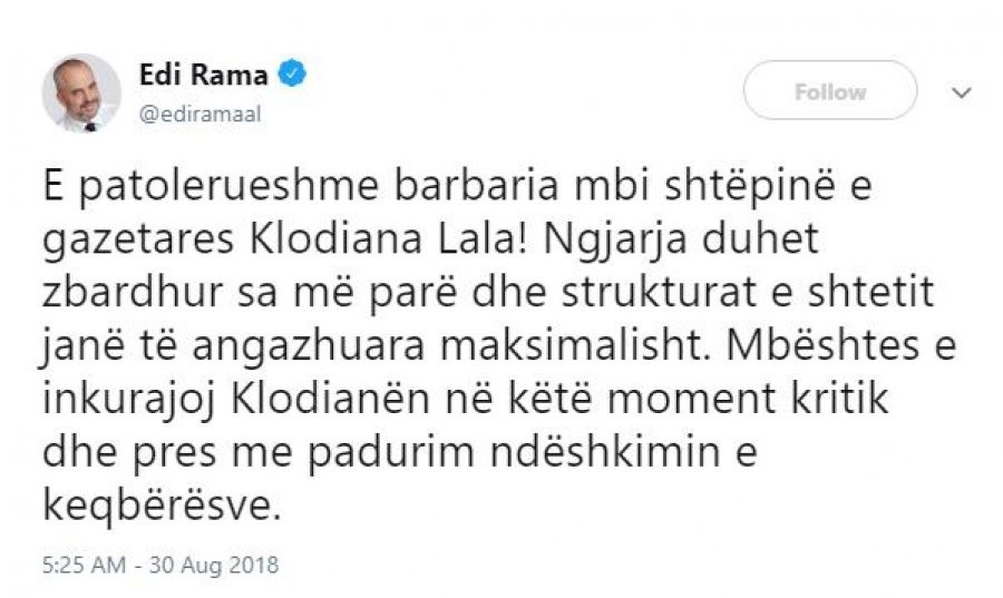 Pas publikimit të lajmit se shtëpia e gazetares së njohur Klodiana Lala ishte qëlluar me breshëri kallashnikovi në orë e para të mëngjesit, ka reaguar edhe Kryeministri Edi Rama i cili përmes rrjetit social Twitter i cili ngjarjen e vlerëson si të patolerueshme ndërsa shtoi strukturat e shtetit janë të angazhuara maksimalisht në zbardhjen e saj.