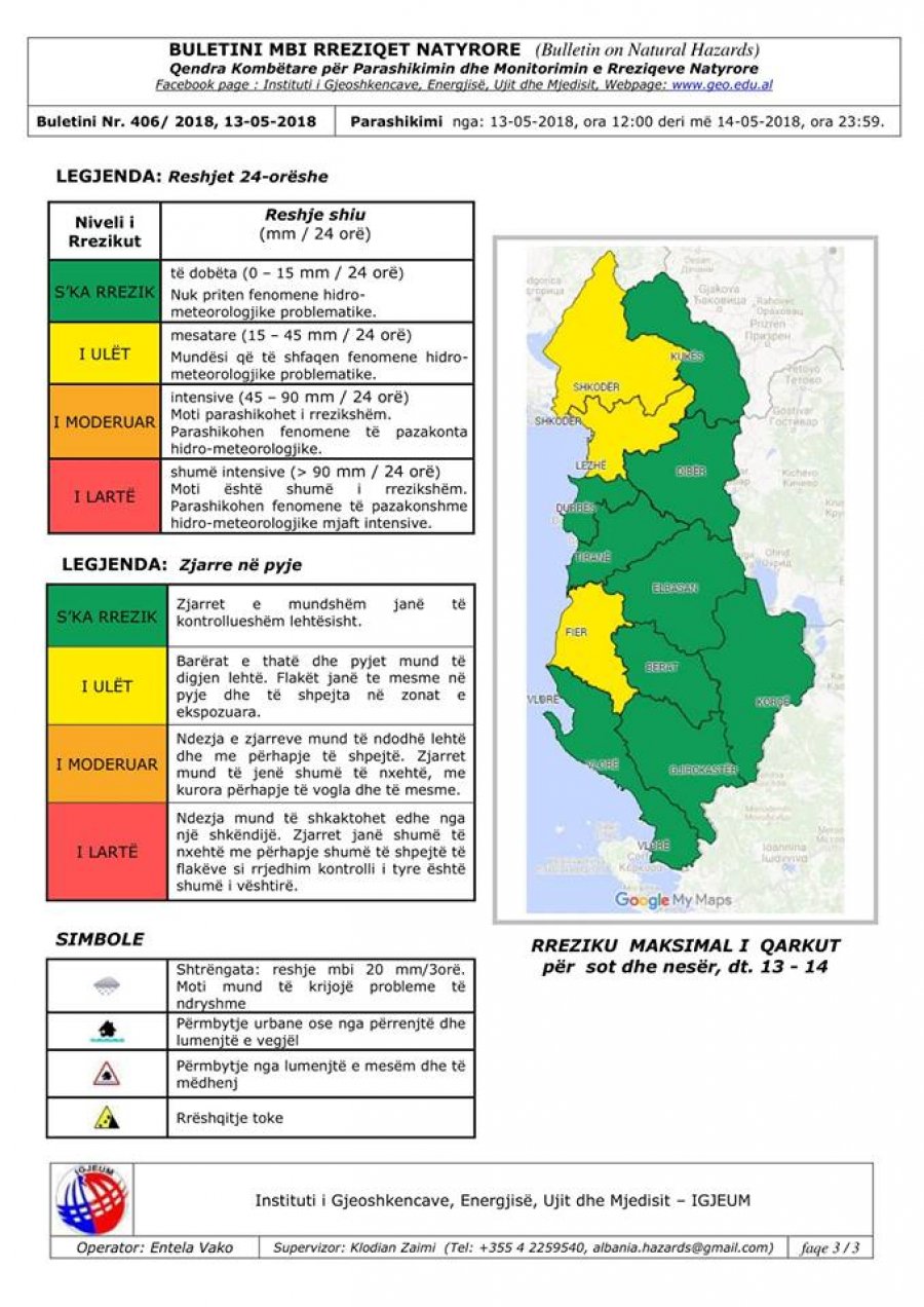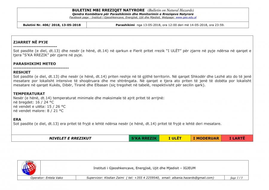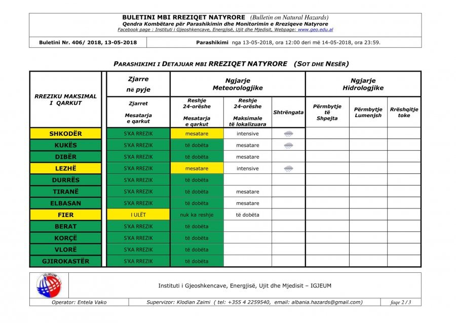 Sot pasdite (e diel, dt.13) dhe nesër (e hënë, dt.14) priten reshje në të gjithë territorin. Në qarqet Shkodër dhe Lezhë ato do t? jen? mesatare por lokalisht intensive të shoqëruara dhe me shtrëngata.