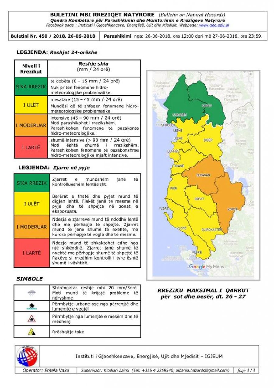 Sot pasdite dhe nesër në shumicën e qarqeve reshjet priten të jenë mesatare deri lokalisht intensive, ndërsa në qarqet Elbasan dhe Korçë pritet të ketë reshje intensive, deri lokalisht shumë intensive në qarkun Korçë (siç tregohet në tabelë, respektivisht për secilin qark).