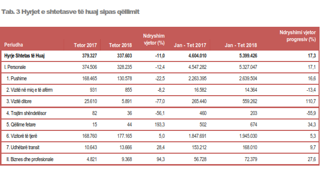 Të dhënat e INSTAT treguan se në tetor 2018, numri i shtetasve të huaj të hyrë në vend është 337.603. Krahasuar me Tetor 2017, ky numër është ulur me 11,0 %.