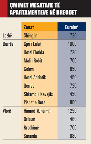 Buxheti është një nga faktorët që ndikon në përcaktimin e zonës për individët që kërkojnë të blejnë në bregdet. Për familjet me një buxhet të kufizuar, Durrësi është zona kryesore, ndërsa familjet me të ardhura më të larta kërkojnë kryesisht në Jug dhe në përgjithësi investojnë për një pronë në komplekse rezidenciale. Bazuar në listimet e pronave që kanë bërë agjencitë e pasurive të paluajtshme, “Monitor” ka përllogaritur çmimet mesatare të apartamenteve në bregdetin shqiptar.
