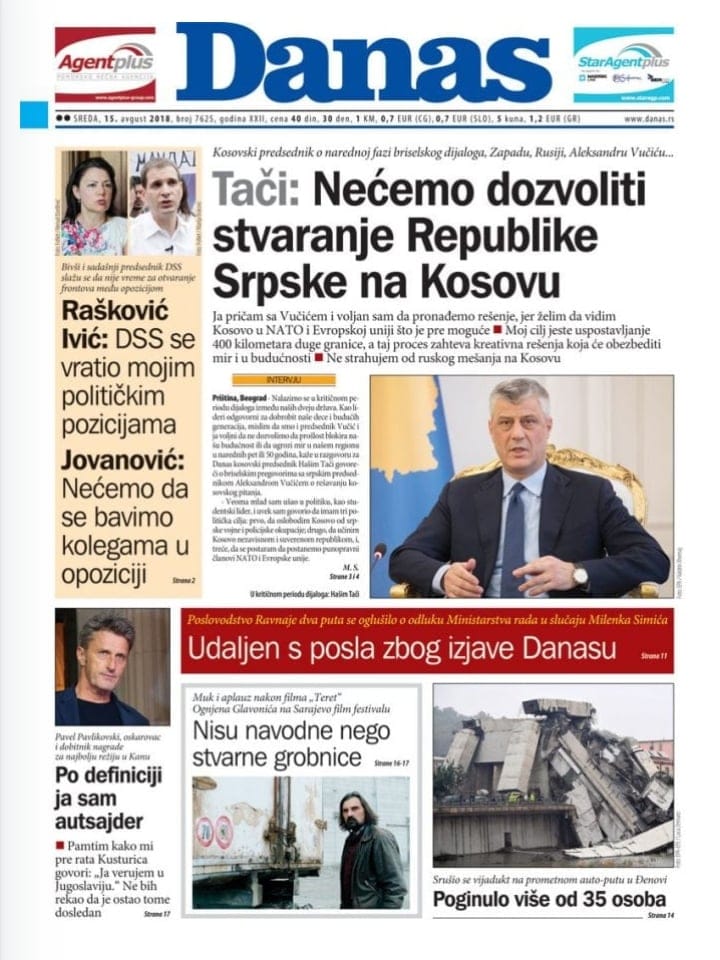 Presidenti i Kosovës, Hashim Thaçi në një intervistë për të përditshmen serbe “Danas” tha se nuk do të lejojmë krijimin e Republikës Srpska në Kosovë ndërsa ka folur për marrëdhëniet me Serbinë, dialogun, Asociacionin, perspektiven evropiane dhe themelimin e FSK-së.