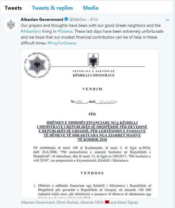 Qeveria shqiptare i ka ardhur në ndihmë Greqisë duke dhuruar 100 mijë euro, që do të shkojnë në ndihmë të të prekurve nga tragjedia e zjarrit të madh, i cili përfshiu dy ditë më parë zonën e Atikës, në Athinë.