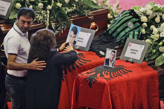 Në ceremoninë e varrimit të 18 prej viktimave, qëndrojnë edhe dy arkivole me trupat e pajetë të të rinjve shqiptarë, Marjus Djerri dhe Admir Bokrin.