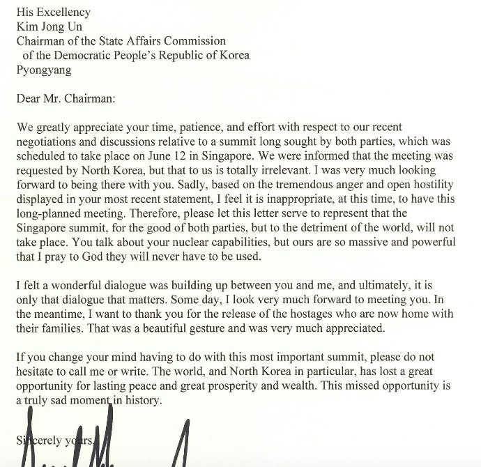 Në letrën e tij drejtuar udhëheqësit koreano-verior, Presidenti Donald Trump shkruan se revoltimi dhe armiqësia e hapur e shfaqur në deklaratat e fundit të Phenianit, e bën të papërshtatshëm për momentin zhvillimin e takimit të shumëpritur, raporton VOA.