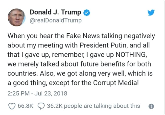 “Kur i dëgjon Mediat e Rreme që flasin negativisht për takimin tim me presidentin Putin dhe për të gjitha ato që kam hequr dorë, ju kujtoj, nuk kam hequr dorë nga asgjë. Ne biseduam vetëm për përfitimet e ardhshme për dy vendet tona”, ka shkruar Trump në Twitter.