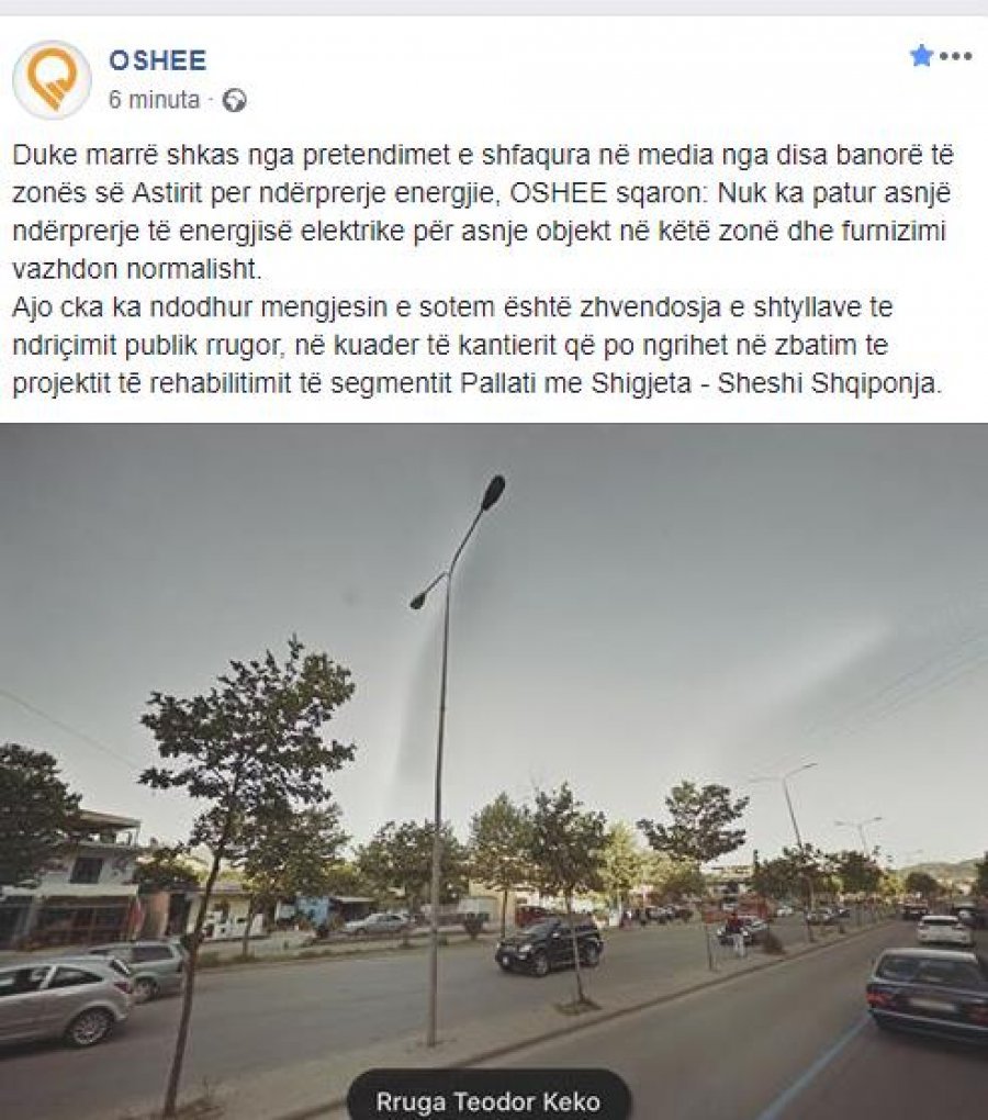 Këtë e ka bërë publike OSHEE-ja, e cila duke sqaruar opinionin mbi lajmin e përhapur për ndëprerjen e energjisë elektrike, thekson se nuk ka pasaur ndëprerje por sot në mëngjes ka filluar zhvendosja e shtyllave të ndriçimit rrugor, në kuadër të kantierit që po ngrihet në zbatim të projektit të rehabilitimit të segmentit Pallati me Shigjeta – Sheshi Shqiponja.