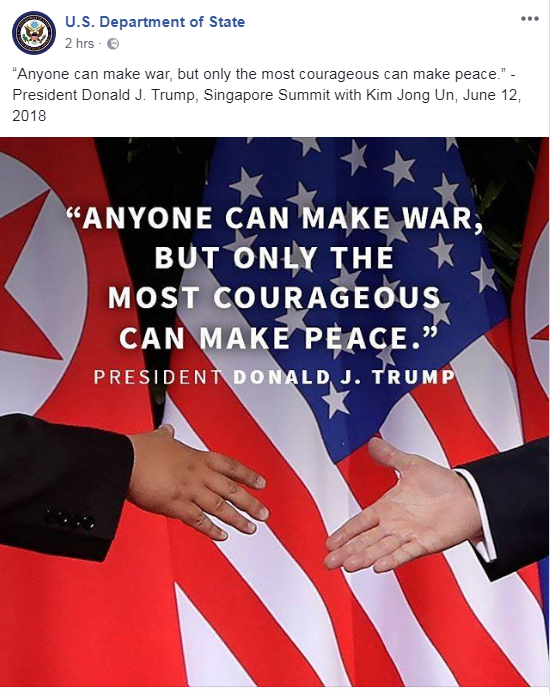 “Çdokush mund të bëjë luftë, por vetëm më të guximshmit mund të bëjnë paqe”. Kështu u shpreh Presidenti amerikan Donald Trump, në Samitin e Singaporit, ku u takua me Kim Jong Un. Këtë shprehje ka zgjedhur ta vecojë Departamenti amerikan i Shtetit duke e shpërndarë në rrjetet sociale si thënie e ditës.